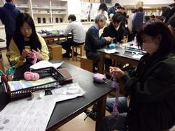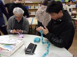 前回の家庭科では、毛糸編みの基礎を学びました。 今回は、それを生かして、エコたわし作りに挑戦しました。 最初に、指を使ってくさり編みを練習しました。 慣れない動きが続き、先生も生徒も悪戦苦闘していました。 慣れてくると、だんだん長く編めるようになり、満足そうな表情が見られました。 |