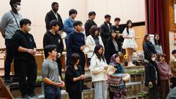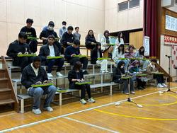 文化学習発表会を開催しました。みらい分校の紹介ビデオの上映に続いて、生徒有志によるマジックやダンス、調べ学習や日本語学習の成果、特別企画の卒業生へのインタビュー、音楽で練習したリズム演奏や合唱が発表されました。最後は、第一中学校本校の生徒を交え、来場者のみんなで「上を向いて歩こう」を合唱して会を終えました。会場には、授業で作った作品や日頃の活動の写真、生徒や先生方の自作作品の展示コーナーが開設され、来場された皆さんにみらい分校の活動の一端を見ていただきました。地域の皆さんをはじめ、教育委員会・市内小中学校の職員、大学生など多くの方々に見守られる中、準備や練習をしてきた成果を生徒たちは存分に発揮することができました。ありがとうございました。 |