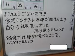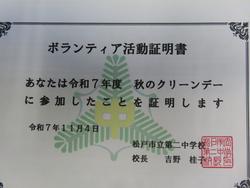 11月4日(火) 11月スタート 11月生活目標 「自ら行動し 生き生きと生活を送ろう」「委員会活動に積極的に取り組み二中を盛り上げよう」「寒さに負けない体を作ろう」 青空の下、11月スタートです。定期テストまで2週間、どの授業も集中している姿が多く見られます。7組バザーに向けて作品作りも進んでいます。最終下校時間も17:00になり、家庭で過ごす時間が長くなります。時間の使い方が大切です。家庭学習に取り組めていますか。 放課後は、秋の一斉清掃「クリーンデー」を保健美化委員とボランティアで実施しました。今回は、通学路を3つのコースに分けてゴミ拾い,校地内の枯れ葉集め等を行いました。参加してくれた皆さん、ありがとうございました。 |