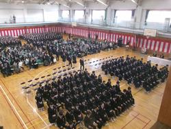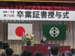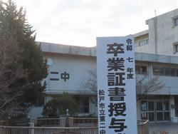 3月12日(木) 令和7年度 第29回 松戸市立第二中学校卒業証書授与式 今日は、卒業式です。朝から先生達が正門の清掃、体育館の放送の準備、3年の先生方は呼名の練習等本番に向けて最終準備を行いました。3年生の教室は、卒業生を迎える準備が完了していました。体育館入口には、転出された多くの先生方からの祝電が掲示されています。 卒業式では、一人一人が感謝と決意の気持ちを込めた「はい」という返事が会場にいる方々に届けられていました。1,2年生の歌と3年生の歌声が互いの心に響き合っていました。とても温かく、とても素敵な卒業式でした。 送辞から・・先輩方が教えてくれた二中Spiritを胸に、今度は私たちが伝統を受け継いでいくと心に決めました。 答辞から・・努力をして無駄になることは絶対にありません。今の努力は未来の自分の味方となります。今まで培ってきたおとを信じ突き進んで行ってください。心から応援しています。・・これから歩むそれぞれの道で、一人一人が自分だけの正解を見つけ、後悔にない人生を歩み抜くことを誓います。 |