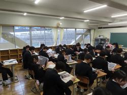 3月16日(月) 1年生の体育は武道「剣道」に取り組んでいます。竹刀の持ち方から足さばきを学び、今日は新聞紙を的に面の打ち方の練習を行っていました。2年生国語では、百人一首の散らし取りゲームで楽しんでいました。素早い動きに歓声も上がっています。 今日のリクエスト給食は、魚料理部門3年3位の「さわらのゆずびたし」とご飯部門2年3位の「炊き込みご飯」でした。柚子の爽やかさが、鰆の優しい味をすごく引き立てていて、春を感じる一品でした。 |