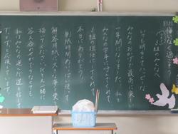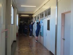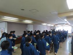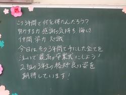 3月11日(水) 「今日の3年生 卒業まで1日」卒業式前日、1,2年生も最後の練習を行いました。心を届ける歌声を創ろうと練習を重ねています。3年生も最後の練習、先生の言葉に応えるように歌声に魂が感じられます。3時間目は、各学級でアルバムへサインを書き合っていました。最後に防災用非常食が配られ持ち帰ります。いよいよ明日は、卒業式です。ガンバレ!二中三年生!! 午後から、1,2年生全員で卒業式準備を行いました。分担された係仕事をテキパキと進めています。背伸びをして上の方までしっかりと拭いている姿に胸が熱くなります。在校生の思いが届きますように・・・ |