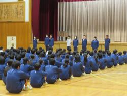 3月2日(月) 3月スタート 3月の生活目標「日々の感謝を言葉や行動で表そう」「1年間を振り返り次年度の準備をしよう」「睡眠・運動・食事のバランスを整うよう」 今日は、生徒会主催の「3年生送る会」です。2時間目の準備から1,2年生の気持ちが伝わってきます。7組の発表は、、3年生が1年生に歌った曲をドレミパイプで演奏しました。1年生の発表は、生い立ちからの成長の過程をベースに、2年生の発表は、学校生活をベースに、各学年が工夫した構成の発表でした。各学年の合唱は、歌詞に思いが込められ、心を伝える演奏でした。3年生保護者からも大きな拍手が送られていました。「ありがとう」の感謝の気持ちで包まれた素敵な会になりました。卒業まであと8日、最後までカッコいい先輩の姿を期待しています。いいね!第二中!! 今日のリクエスト給食は、ゴハン部門2年3年の1位「チーバー君カレー」でした。大盛はチーバ君2個です。3年生の給食も今週で最後になります。残された日々を大切に・・ |