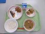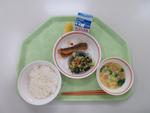 ごはん、さばの塩焼き、切干大根の炒め煮、小松菜のごま和え、豚汁、牛乳