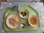 ☆今日の給食(ドリア風クリームライス、わふうサラダ、アルファベットスープ、牛乳)