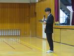 みなさん、新しいリーダーの顔と名前は覚えましたか。これから二中を引っ張っていってくれるリーダーたちです。応援の気持ちを持ち、これからしっかりついていきましょう。リーダーは全校生徒の顔を見て、これから二中を引っ張っていく覚悟はできましたか。リーダーの経験はこれからの成長の糧になります。これから一緒に頑張っていきましょう。そして、リーダーはみんなの前を歩き、みんなを率いていく存在です。しかし、一人で全てやらなければいけないということではありません。すぐ後ろには仲間がいます。困ったときにはここにいる全校生徒を頼ってください。きっと助けてくれます。そしてリーダーではない人達もリーダーをサポートし、全員で助け合いながら二中を作っていきましょう。