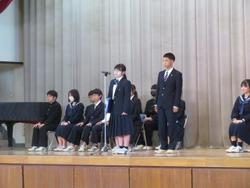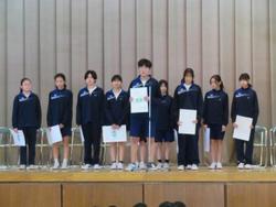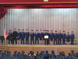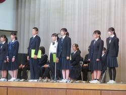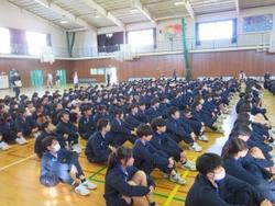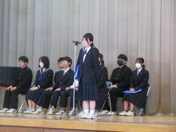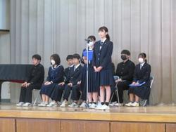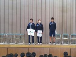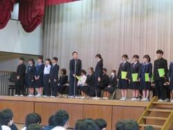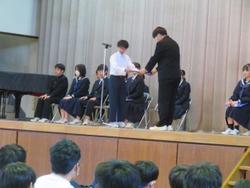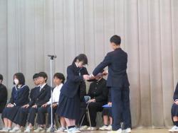 今日の5校時は生徒集会で部活動新人戦等の表彰の報告がありました。次に生徒会、委員会の委員長、部活動の部長会長の引き継ぎが行われ、3年生の旧委員長からファイルが手渡しされました。「責任を持って最後までやり遂げます」と新しいリーダーから発表があり大変立派でした。集会後には、SNSの利用について西川先生から話がありました。情報を発信する前に想像する力を身につけていきたいですね。