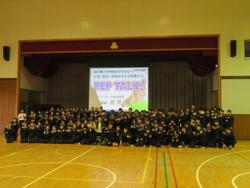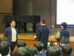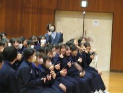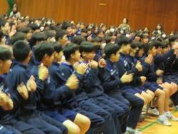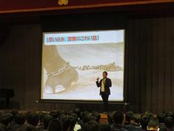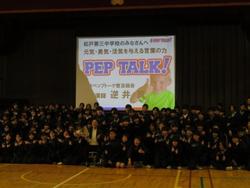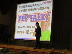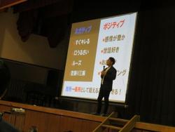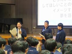 今日の午後は、PTA文化講演会で心に火をつける講演家の逆井先生を講師にお迎えし「ペップトーク講演会」を行いました。言葉、動作、表情、イメージの4つを意識的にプラスの状態にする練習で拍手から全校で「いいね!」のポーズをしました。みんな笑顔でした。人間は基本的にはネガティブな生き物。言葉は可能性を引き出すということを学びましたね。実践していきましょう。