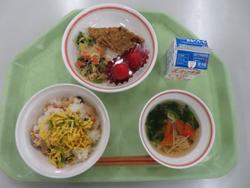 朝から冷たい雨でした。今日は、3年生を送る会の前日準備で1.2年生は明日の発表のリハーサルを行いました。給食は、ちらし寿司、白身魚の磯辺揚げ、すまし汁。ひなまつりの献立でおいしかったです。
