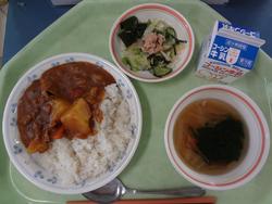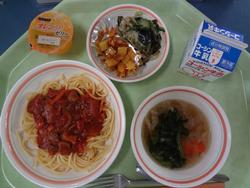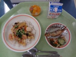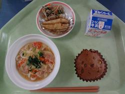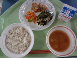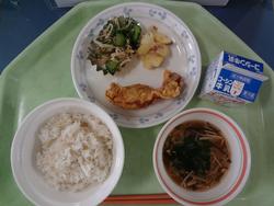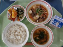 ごはん 豚肉と生揚げの味噌煮 青菜のごまあえ 卵とわかめのスープ 牛乳 |