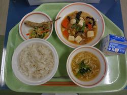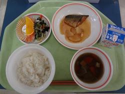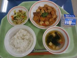 ごはん 鶏肉と大根の煮物 青菜のごまドレ和え 卵スープ チョコクレープ 牛乳