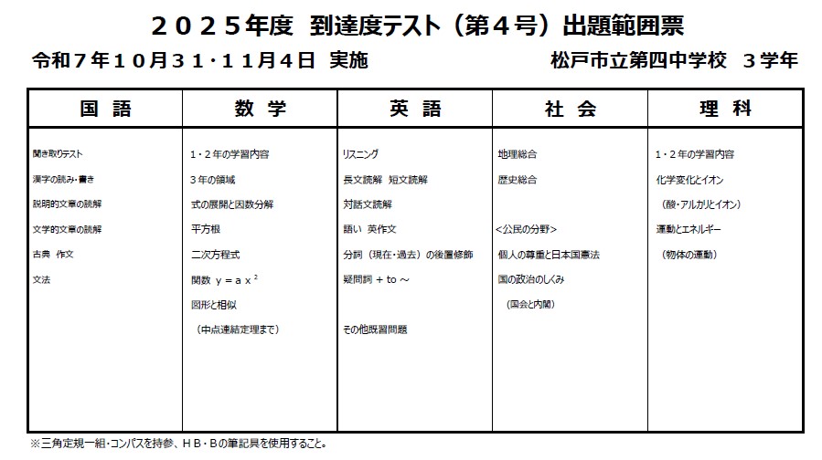 第4回到達度テストの範囲表です。
