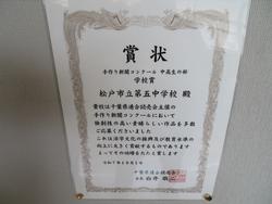 夏休みの社会科の課題(任意)で、「手作り新聞コンクール」(千葉県連合読売会主催)に五中生の2年生が多数出品して、学校賞をいただきました。また、その中から特に優秀な作品として、本校生徒がデザイン賞を受賞しました。情報が溢れる現代、必要な情報をいかにして、相手に伝えるか、様々なアイディアを凝らした作品が多かったです。準備ができ次第、優秀作品を掲示しますので、今後の新聞づくりなどの参考としてみてください。