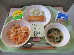 今日は「残菜を減らそう~中華風給食~」という献立名の2年生が考えてくれたメニューです。キムチチャーハン、鮭とチーズの春巻、青のりポテト、卵スープ、はちみつレモンゼリー、牛乳で、五中生の好きな給食メニューの上位に入るものをまとめたものでした。人気メニューだけあって、どれも本当に美味しい料理でした。