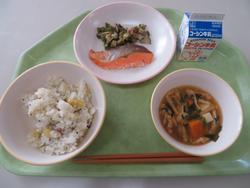 今日は「短い秋を味わおう!秋尽くしの献立!!」という2年生考案のメニューで、さつまいもごはん、鮭の塩焼き、ピーマンときのこのバター醤油炒め、かぼちゃの味噌汁、牛乳でした。秋という季節を味覚でも味わえるのがとても嬉しいですね。