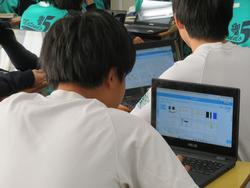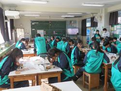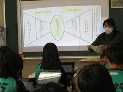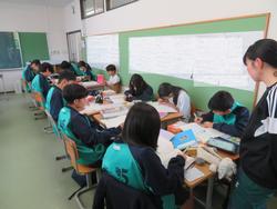 1年生の国語では辞書(紙媒体)を使っての語句調べをしていました。PCで文字を入力して検索するとすぐに意味などが出てきますが、紙の辞書の活用も大切だと思います。また、2年生の国語の授業では説明文のまとめをしていました。どのようにまとめたらわかりやすいか、思考ツールを活用してまとめている生徒もいました。PC上で友人のまとめ方を見比べることで、様々な方法があることを学んでいました。紙媒体とICTの活用どちらも大切であると感じました。