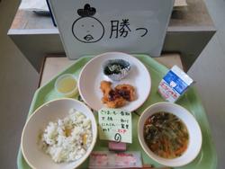 今日は2年生が考えてくれた「受験に勝つ!合格祈願ランチ」です。さつまいもご飯、チキンカツ、ワカメときゅうりの酢の物、季節の野菜たっぷりの味噌汁、手作りリンゴゼリー、牛乳でした。栄養たっぷりな献立でどんな試験もパスできそうなメニューでした。