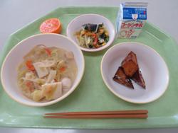 今日は2年生が考案したメニュー「郷土料理でぽかぽか給食」です。ちゃんぽん麺、海藻サラダ、大学芋、みかん、牛乳です。ちゃんぽん麺は豚肉やいか、あさり、かまぼこ、うずらの卵、人参、キャベツ、もやし、しょうが、コーンと多種多様な具材と深みのあるスープとが合わさり、本格的な一品でした。