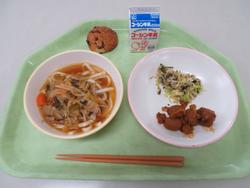 今日は2年生考案のメニュー「冬の寒さを吹き飛ばせ!ホカホカメニュー~旬の食材たっぷり~」です。キムチうどん、甘辛ケチャップの肉団子、キャベツともやしの和え物、スコーン(チョコチップ)、牛乳です。キムチや甘辛ケチャップによって身体の中からポカポカするような感じがしました。また、スコーンがサクサク生地でチョコチップとの相性も良く、とても良いアクセントでおいしかったです。