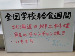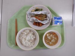 今日は「北海道」ということで、鮭のチャンチャン焼き、揚げいももち、呉汁、小松菜のごま和え、牛乳です。