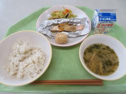 今日は2年生考案メニュー「寒さ対策!!ぽかぽか給食」で、ごはん、鮭のアルミ焼き、お豆サラダ、大根汁、ごま団子、牛乳です。大根汁は温かな汁物として、大根の根も葉も余すところなく利用した味噌汁で、ほっとする味わいでした。鮭のアルミ焼きは脂ののった鮭の切り身にキノコや玉ねぎがよく蒸されており出汁も染みこんでいて相乗効果のあるとてもおいしい一品でした。まだまだ寒い日が続きます。給食をはじめとした食事を摂って内側から体温を上げるようにしていきましょう。