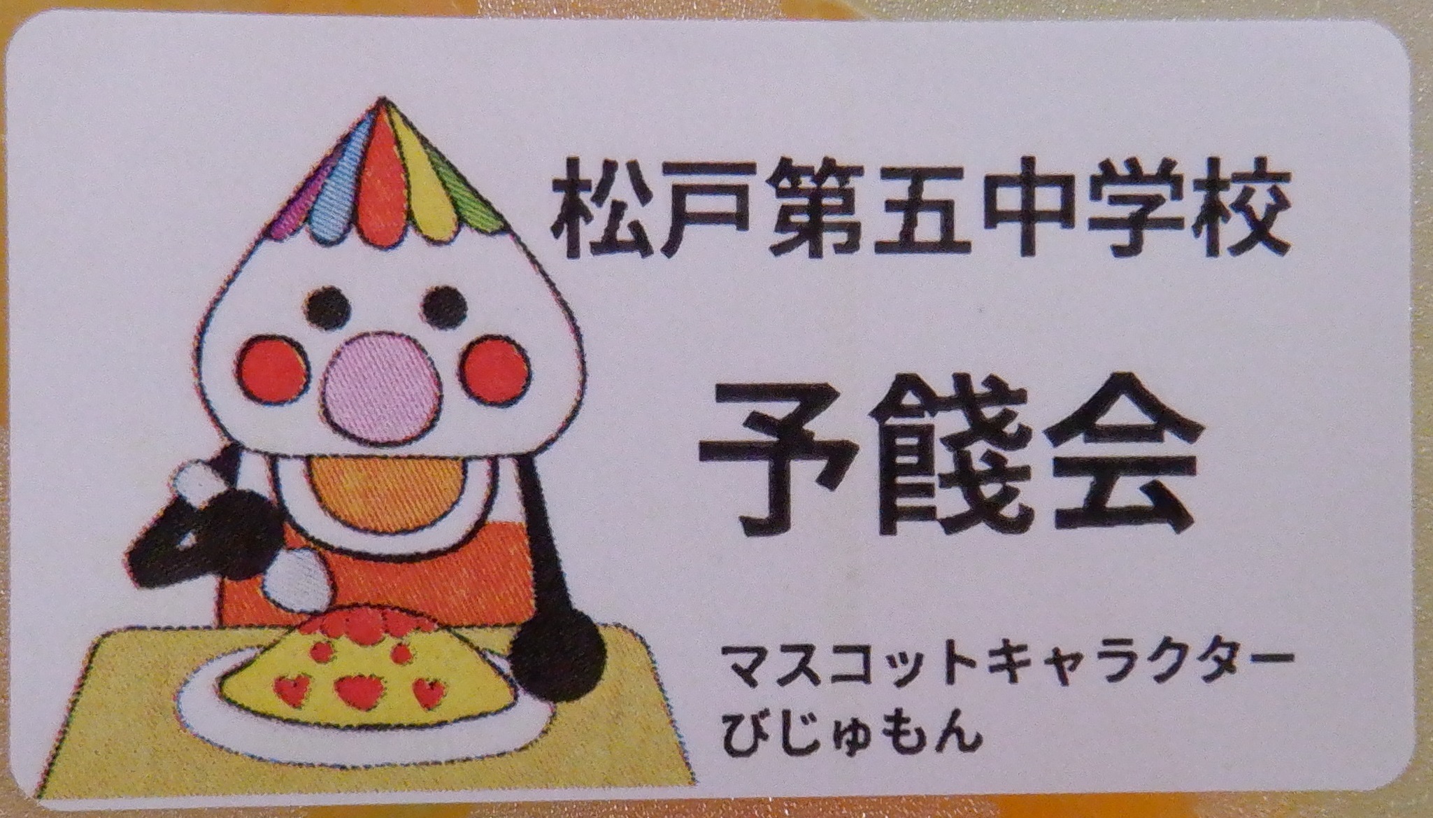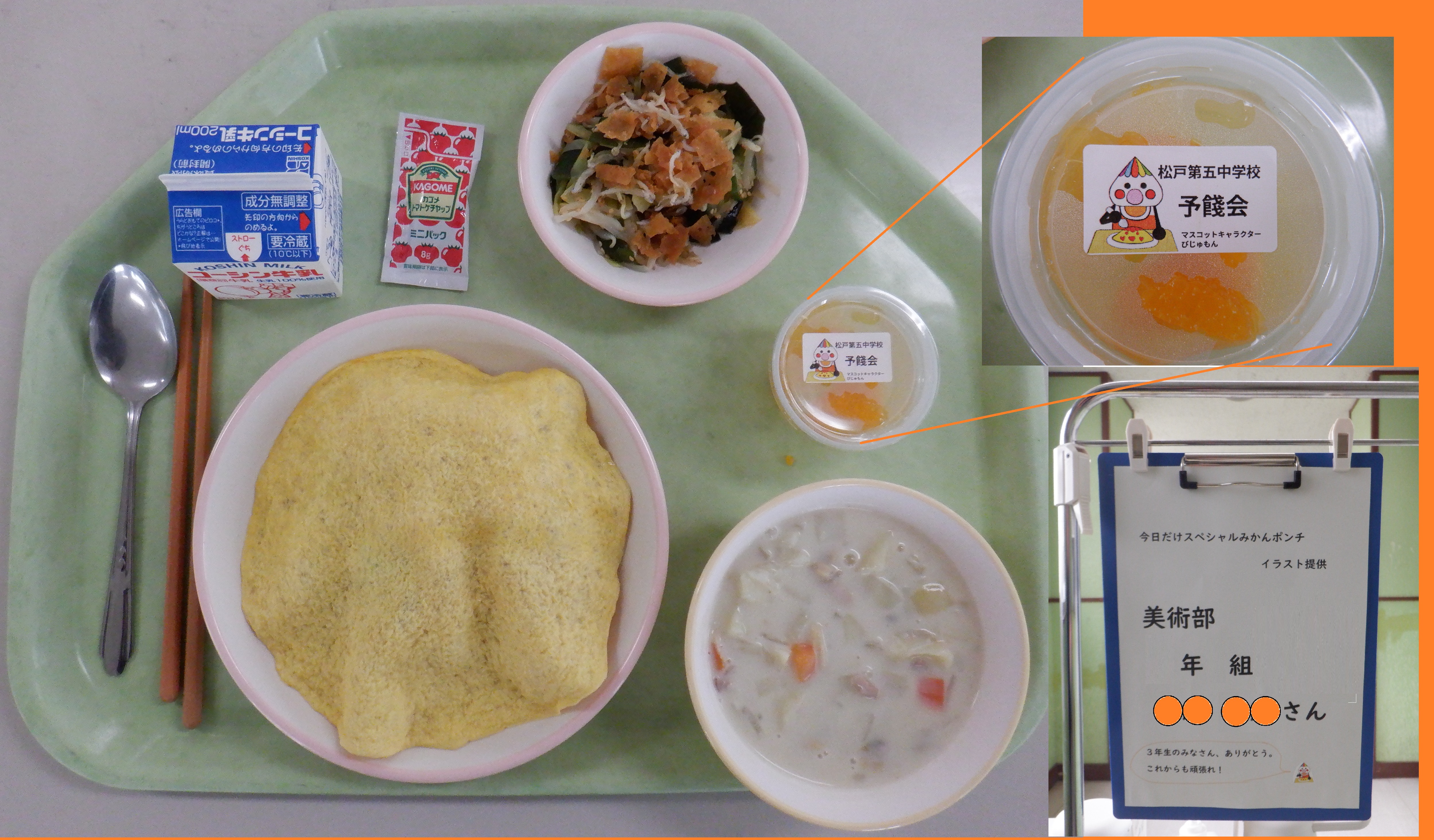 今日のみかんゼリーのふたには、美術部の生徒がデザインしたかわいい「びじゅもん」のシールが貼られていました!