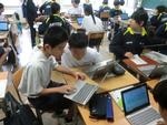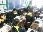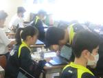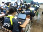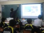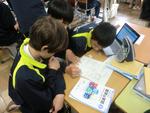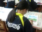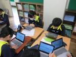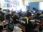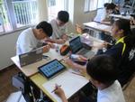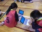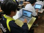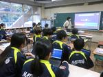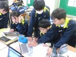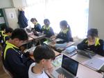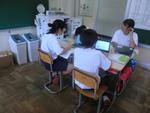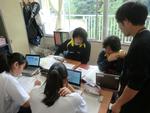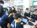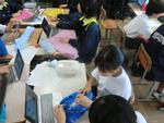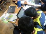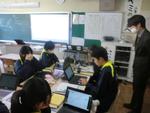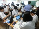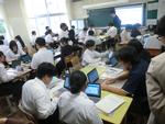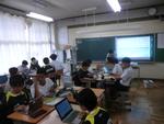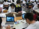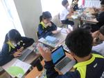 1年生の国語では、「河童と蛙」の紙芝居づくりを仲間と協力して作成していました。タブレットを使って情報収集したり、調べたことを相談しながら作画していきました。社会ではEUについて議論をしています。仲間の意見を参考する他者参照や途中参照をタブレットで共有しながら自分の考えを深めていました。