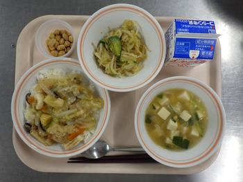 中華丼 中華風サラダ 中華風コーンスープ きな粉豆 牛乳