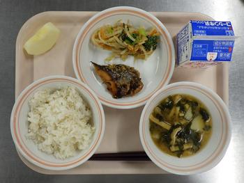 ごはん アジフライ おかか和え さつま汁 オレンジ 牛乳