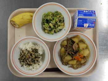 ごはん しそ風味ふりかけ 肉じゃが 小松菜のごま和え バナナ 牛乳