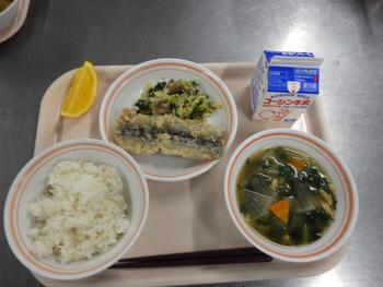 今日は秋刀魚の竜田揚げです。秋刀魚は細い魚なので、開くととても薄くなります。お皿いっぱいに見えますが、いつもの魚より重量は少し少なめです。脂もよくのっていておいしかったのか残食は少なめでした。