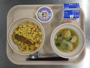 キムチチャーハン きびなごの唐揚げ 肉団子スープ ブルーベリーゼリー 牛乳