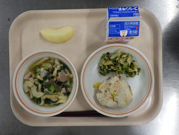 小松菜とさつまいものごはん 鯖のピリ辛焼き おひたし 味噌汁 十五夜デザート 牛乳