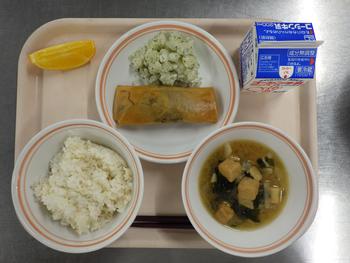 ごはん ひじきの春巻き 若草ポテト 味噌汁 オレンジ 牛乳