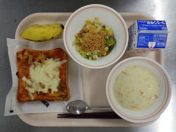 ピザトースト パリパリサラダ クリームコーンスープ バナナ 牛乳