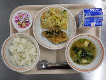 ごはん サバの竜田揚げ 春雨サラダ 味噌汁 三色花ゼリー 牛乳