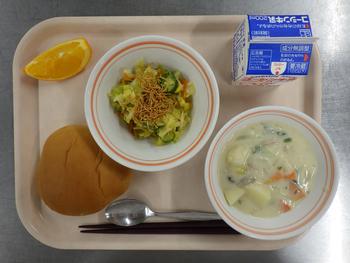 ロールパン クリームシチュー パリパリサラダ オレンジ 牛乳