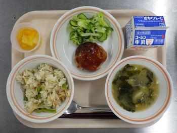 たけのこごはん 豆腐ハンバーグ フレンチサラダ 味噌汁 フルーツミックス 牛乳