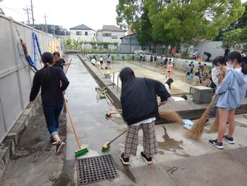 午後は6年生がプール清掃の仕上げを行いました。 デッキブラシを持ってプールの底を磨いています。 |