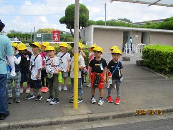 1・2年生は学校探検です。ペアを作って学校を探検します。 皆で集まって、ルールの確認をしています。 |