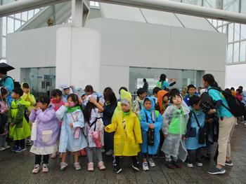 到着すると、外はあいにくの雨。 雨具を準備して移動します。しっかり列になって移動しています。 |