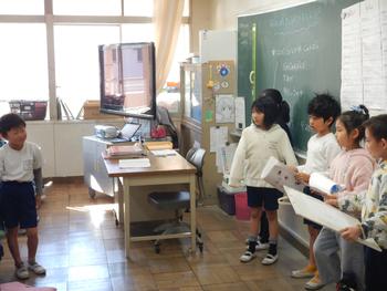 2年生は、生活科の町探検についての発表練習をしています。 自分たちの発表をタブレットで撮影し、見直しをしています。 |