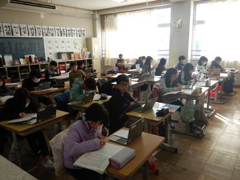 3,4時間目は5年生です。 黙々と文字に正対しながら書いています。 |