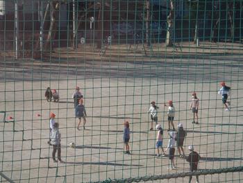 | 4年生は外で体育の授業を行っています。皆ボールに集まり、力いっぱい走り回っています。 | |