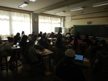 六実高校から、将来先生になりたいと思っている生徒達が、1日教室に入って体験をしています。 子ども達の様子を、しっかり観察しています。 |