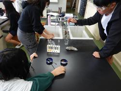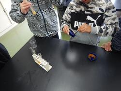 安全のため、保護めがねをつけて実験を進めていました。