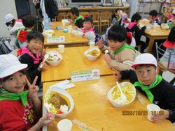 お昼はカレーライスです。ちなみに緑のバンダナが2年生、ピンクのバンダナが1年生です。