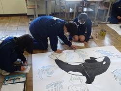 今回はモザイクアート係を覗いてきました。モザイクアート係は、本番前に練習をしておこうということでムツゴロウを作成しました。ハサミでまっすぐに切る、のりで指定された場所にきれいに貼るといった単純作業でしたが、皆とても楽しそうに活動をしていました。