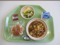 2学期最後の給食は、少し早いクリスマスメニューです。「ポテトミートグラタン」は、北海道産のじゃがいもとミートソースをからめ、ホワイトソースとチーズをのせて、オーブンで焼きました。じゃがいもは、活動するエネルギーのもとになります。そのほかにも、風邪の予防やがんの予防に役立つ、熱に強いビタミンCや、体内の塩分を排出するカリウムなどが多く含まれています。デザートは「チョコムース」です。楽しんで食べてくださいね。 |