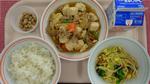 ごはん、にくどうふ、大豆もやしのピリッと和え、黒糖豆、ぎゅうにゅう |